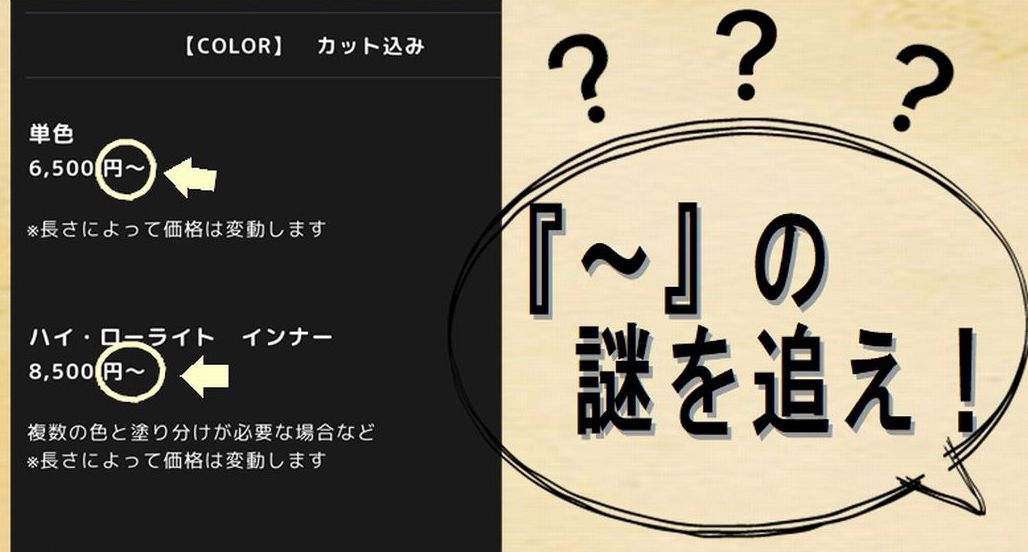 『〇〇〇円~』の謎を追え!w Category:その他:雑記 Date:2020年02月28日 当店のホームページでも表記として使っていますが… 『~』 いろいろなお店のメニュー表記で見かけませんか? 〇〇〇円~という場合の『~』です。 当店の記載について、ちょっとご説明してみますね。 雑談的に気楽に読んでもらって何気にでも納得してくださるとうれしいです。 ↑画像のように、例えばカラーについてですと それぞれのメニューにおいての最低価格といった感じで表記しています。 私たちの業種の場合、お客様それぞれのスタイルが同一の状態・条件で全く同じようになることはまずありません。 短めのオーダーの方であっても、長めのオーダーの方であっても、それぞれ違います。 その中で髪の状態(ダメージ状態)なども加味して、必要な施術工程と必要な剤をチョイスして実際の施術をさせていただきます。 それらの違いによって、ご料金に変動があるために、まず基本となる最低価格にて表記しているということなのです。 「えっ!ということは上限はないの!?」 「表記を大きく上回る価格になるようでは参考にならないなぁ」 「あまりにもコストがかかるとコワイから…」 そんなご心配もあるかと思いますし、もし私自身であってもそう感じることはあると思います。 ですが、ホームページ上などでは簡潔に見やすい表記が求められていると思うので細かな表記とはしていません。(実際、様々過ぎて出来ないとも言えますし) では、『なんとなく理解してよ』と言ってるという訳でもありませんよ! ~と表記してあるからといって怖がらないでくださいww ボッタくりなんて絶対しませんからww 当店では、お客様に了解なく施術させてもらうことはありません! スタイルなどのカウンセリング時に必要な施術内容やかかるコスト(ご料金)などの詳細を必ず事前説明させていただいています。 そして、詳細のお問い合わせにも随時対応します。(電話・LINE) 既存のお客様であればヘアカルテの履歴がありますので、それを元にお答えできると思います。 例)LINEであれば「今度、カラーしようと思うのですが、いつものスタイルくらいで何円くらいかかりますか?」とかトークに書いて送ってください。カルテ確認後にご返信します。 ご新規様は髪の状態が分からないと判断できない部分もありますので明確にはお答え出来ないのですが、もう少し詳しい程度であれば電話などでもお答えで出来るかと思います。 上記のようなことを含む【事前カウンセリング】を大事にして取り組んでいますので安心してくださいね! よくお客様にもお話しするのですが「聞く(問う)のはタダですよw」と。 悩んだり考えたりググったりするのもイイとは思いますが、髪のことなら私たちプロに尋ねていただくのが一番の近道だと思うので、遠慮なんていりませんし、聞いたらやらないといけないなんてこともありませんので、お気軽になんでもお尋ねくださいね(^_-)-☆ [5回]PR