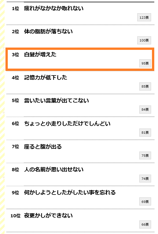 こんな統計がありました Category:その他:雑記 Date:2017年10月31日 ↑これを見て何についての統計か分かりますか? 『自分が老けたなと思うとき』だそうです。。 認めたくないですがw 私も何個か当てはまっています(^^; しかし、そんなことが言いたいのではなく! 何かに気付きませんか!? 主に挙がっているのが“体(力)的な衰え”ですよねぇ。。 基礎体力作りとか脳トレとか…私は専門出ないのでよく分かりません。 しかし、いわゆる“見た目”についての中で『白髪』というワード。 白髪は誰でも、人によっては若くても生えてきてしまします。。 白髪が頭毛の30%くらいにないってくると相当目立ちます。 鏡を見るたび気になって「染めようかなぁ・・」と頭をよぎるはずです。 何より一般的にその状態では【実年齢+5歳】と言われます。。。 25歳でも30歳、35歳でも40歳、45歳でも50歳…といった具合ですよ。 う~ん、それはいただけませんねぇ( ;∀;) でも!! 言葉は悪いですが・・・ 『時間とお金』かければ自分で汗を流すこともなく、必要時間にしても1か月とか2か月に数十分ですし、費用対効果から考えてもコストもそんなに驚くほどはかかりません。 それだけの時間とお金をかけえることで見た目が良く変わるならアリではないですか!? 最近、白髪が気になり始めたって人も、老けてるなんて言われてしなった人も… この機会に『白髪をキレイに染めてみる』ことにチャレンジしてみませんか? きっと今までのあなたではない、生まれ変わった(←言い過ぎw)あなたになれるはずですよ(≧▽≦)b ARTISANでは、カット込みの総額で一般的なスタイルでしたら参考価格6800円~出来ますので、気になる方はとりあえずでもOKなので一度相談なさってみてくださいね! [0回]PR