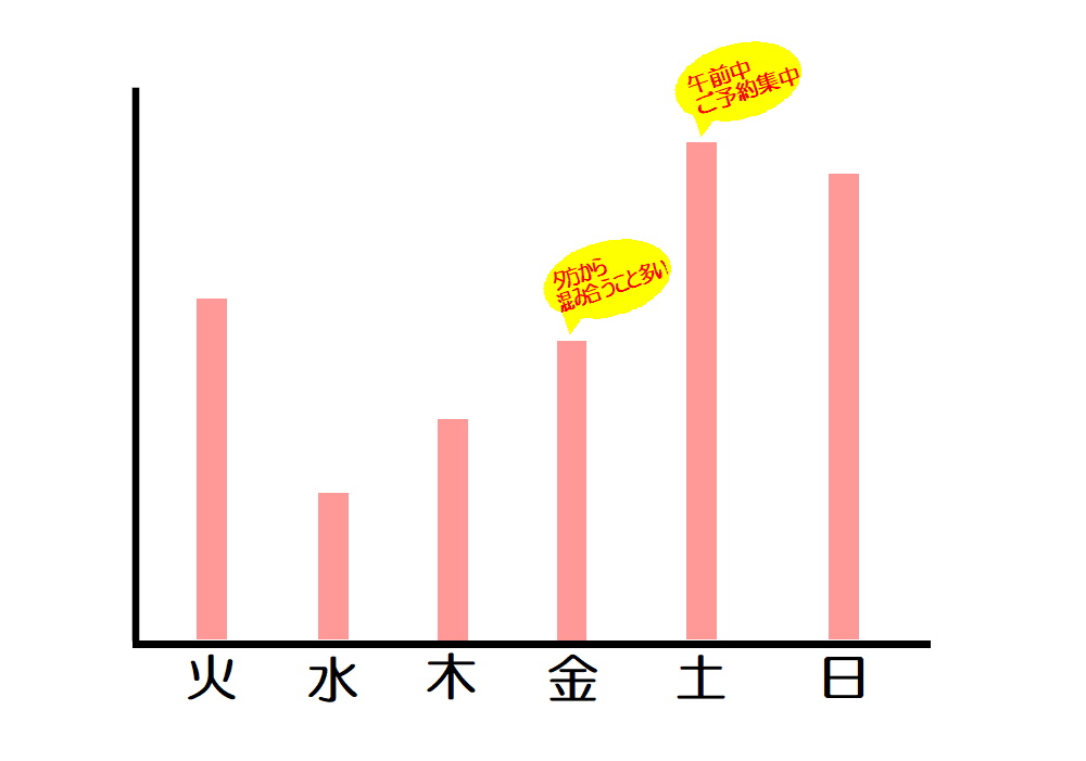 参考にしてください!曜日別考察 Category:その他:雑記 Date:2018年03月15日 大変心苦しいのですが、時にご予約やご来店いただいた際に 「すみません、その時間はもうご予約があってお取りできません・・」 「今すぐは出来ないのですが・・」 といったように状況によってはご希望に添えないことがあります。 上の画像を見て頂きたいのですが、不思議とご来店(ご予約)数には曜日で偏りがあります。 勝手な考察(想像)になるかもですが、このように考えて(思って)います。 火曜日は… 月曜日にお休みをいただいているために明けて「今日は開いている!」 またはお仕事柄、火曜日がお休みの方も一定数おられるためにわりと多くの方にご来店いただけるのでは!? 水曜日は… 実は週の中でも一番ご来店数が少ないのです。 週中というのはなかなかお時間が取りにくいものなのでしょうか? 木曜日は… いわゆる普通な感じと言いますか混むこともなければ少なすぎでもありません。 金曜日は… 木曜日と似かよっていますが夕方からが混み合うこと(ご予約・来店)が多いです。 これは明日からお休み(土日)なので仕事帰りなどの時間を有効に使ってお休みに時間を取らなくていいようにしよう。または次の日からがお休みからがであれば急いで帰ってゆっくりしようという考えが他の日より少なく時間・心理的にもゆとりがあるということではないか!? そんなふうに考察しています。 土日においては平日とは比べものにならないご来店をいただいております。 とてもありがたく感謝しかありませんが、お仕事がお休みの方が大半であること、逆に言えば仕事の日は時間が取れず、また夜も帰宅が遅いのでカットに使う時間はないということから集中・混雑するのだと思っています。 また、土曜日は午前中がご予約としては多い人気の時間帯です。 早めにカットしてお出かけしたいって感じでしょうか!? 日曜日は逆に午前中、特に9時開店なのですが9時からは不人気ですw 早起きするのはしんどい、日曜くらいはゆっくり寝ておきたいって感じでしょうか!? 上記の状況が考察のように起こっているのかはあくまでも想像ですが・・・ オススメとしましては 平日は土日に比べれば空いていますので、もしお時間が取れるようでしたらお電話ください。 希望される時間が比較的スムーズにお取りできると思います! 時間の取りやすい学生さんは平日が狙い目ですよ~ じっくりとカウンセリングしますしサービスだってできるかも!?w 土日でしたら、みなさまお忙しいでしょうからご予定などあってスケジュールがタイトな方は事前のご予約をしてくださいね。何日前からでもお受けしておりますので。 また、あえてスケジュール調整できるとしたら土日はお昼間(2時~4時あたり)を狙ってみられたり、日曜の朝少し早起きして9時からなど。 上記を参考にされて貴重なお時間をもっと有意義に有効に使っていただけたらと思います。 [0回]PR
