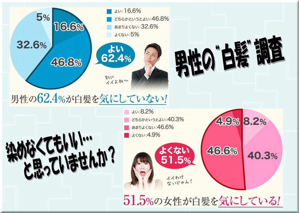 『ちょっとくらいの白髪なんて目立たないだろ⁉』と思いがちですが、お仕事の都合などで黒髪の場合、コントラスト(対比)によって白髪の本数は少なくても意外と目立つのです。