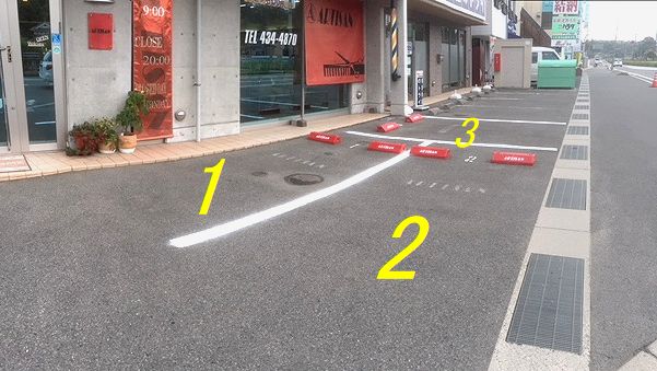 駐車場 確認してくださいね Category:その他:雑記 Date:2018年05月30日 駐車場は店舗全面 No.1~3となります。 車(車輪)止めが赤く塗ってあるところです。 画像のように少し変則的なので『ん!?』ってなっちゃうかもですが… ご了承・再度ご確認お願いいたします。 P.S 最近はバックカメラなど装備されてる車が多いので杞憂かもしれませんが、もしも駐車するのが自信がない、難しいといった方がいらっしゃればお申し出くだされば私が代わって駐車も致しますので遠慮なくお申し付けくださいね。 [0回]PR