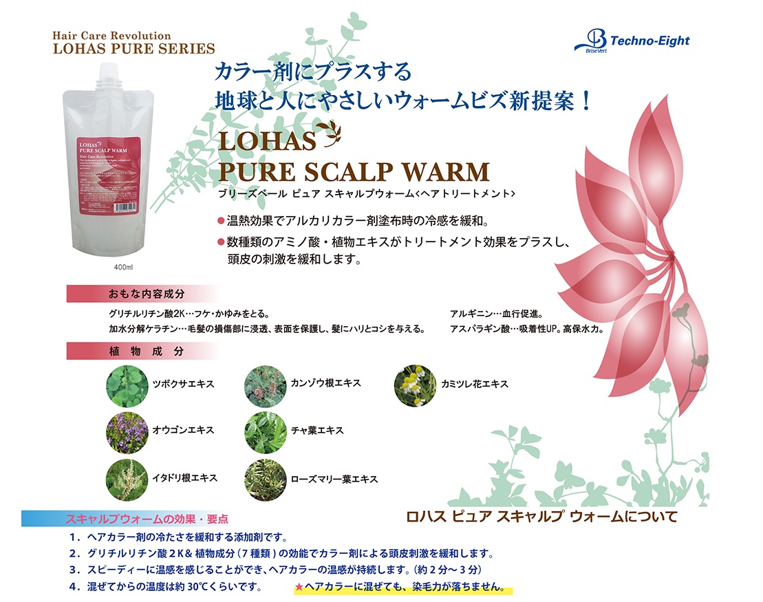 カラー剤の『ヒヤッ』を緩和します! Category:ヘアケア用品 Date:2016年12月16日 寒くなりましたねぇ。 雪が降るかも…という予報もちらほら聞こえ始めたこの頃。。 これからの時期、クリスマス・お正月・成人式などを控えてカラーやパーマをする人も増えているように思います。 カラーは薬剤を塗る時どうしても最初、頭皮が『ヒヤッ』とします。 特に冬場は暖房が効いた室内でも嫌な感じがするものです。 そこで、冬場は不快な感じをなくすためにカラー剤を温かく感じさせてくれるものを使っています。これまでもそういった製品はあったので使ってはいましたが正直効果がまちまちというか・・今シーズンは写真の『ピュアスキャルプウォーム』を導入しました。 これがすごくイイです! 冷感を緩和(結構温かいです)してくれるのはもとより、数種類のアミノ酸・植物エキスがトリートメント効果をプラスし頭皮の刺激をも緩和します。しかもカラー剤臭さというか匂いも軽減してくれるようで残臭が気になりにくくなっています。 あのヒヤッとした感じが嫌だった方、もう大丈夫ですよ(^o^)b 今年も残り少なくなりましたが、これからイベントが多くなる時期ですし、髪のオシャレを忘れずに素敵なスタイルにしてお過ごしくださいね♪ [0回]PR